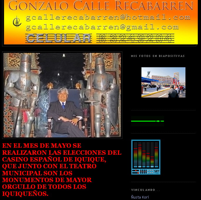 Calle actualmente integra el directorio del Casino Español y desarrollará una agenda cultura al interior de esta institución iquiqueña. Gonzalo Calle muestra su agenda de trabajo y nuevos proyectos a través de su blog.