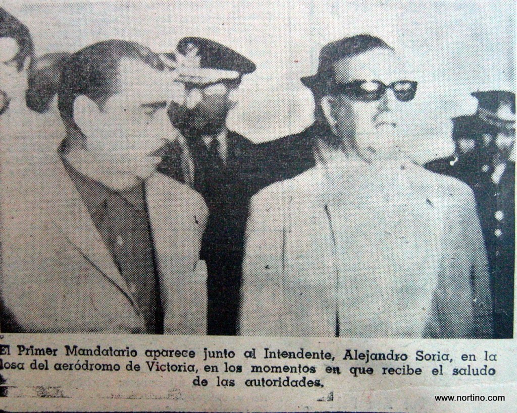 Presidente Salvador Allende e intendente Alejandro Soria en aeródromo de Victoria.