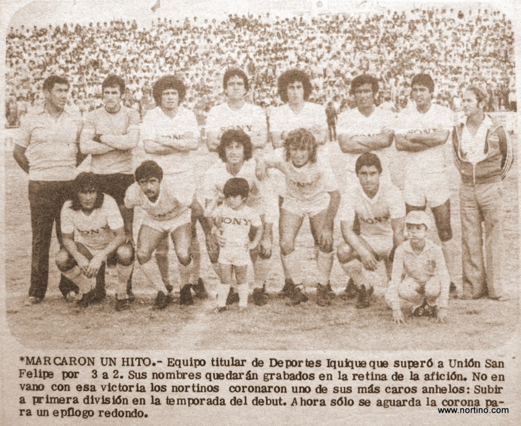 Deportes Iquique Campeón 1979: El equipo titular de Deportes Iquique que superó a Unión San Felipe por 3 a 2. Sus nombres quedarán grabados en la retina de la afición. Con este triunfo Iquique logró subir a Primera División en su temporada debut.