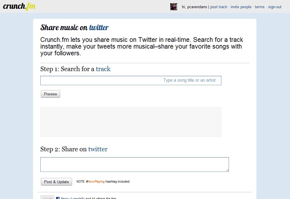 Musicaliza Twitter con Crunch.fm, un servicio que te permite buscar tu música favorita y enlazarla directamente a tu cuenta de Twitter.