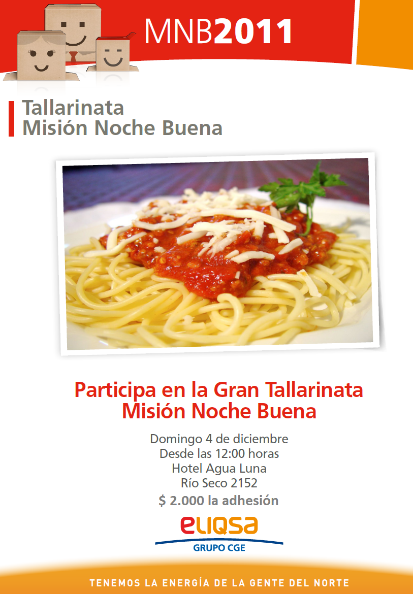 Tallarinata Misión Noche Buena. Domingo 4 de diciembre a partir de las 12:00 horas en Hotel Agua Luna. $2.000 la adhesión. Música en Vivo, karaoke, concursos y magia.
