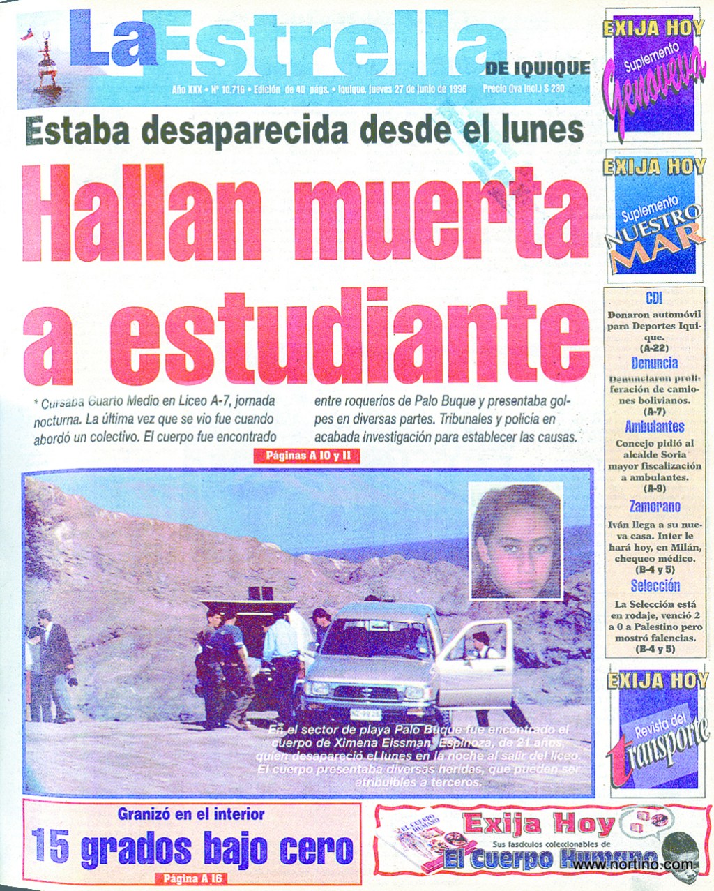 La víctima fue identificada como Ximena Eissman Espinoza, de 21 años, estudiante de cuarto año medio de la jornada nocturna del Liceo A-7 Bernardo O’Higgins.