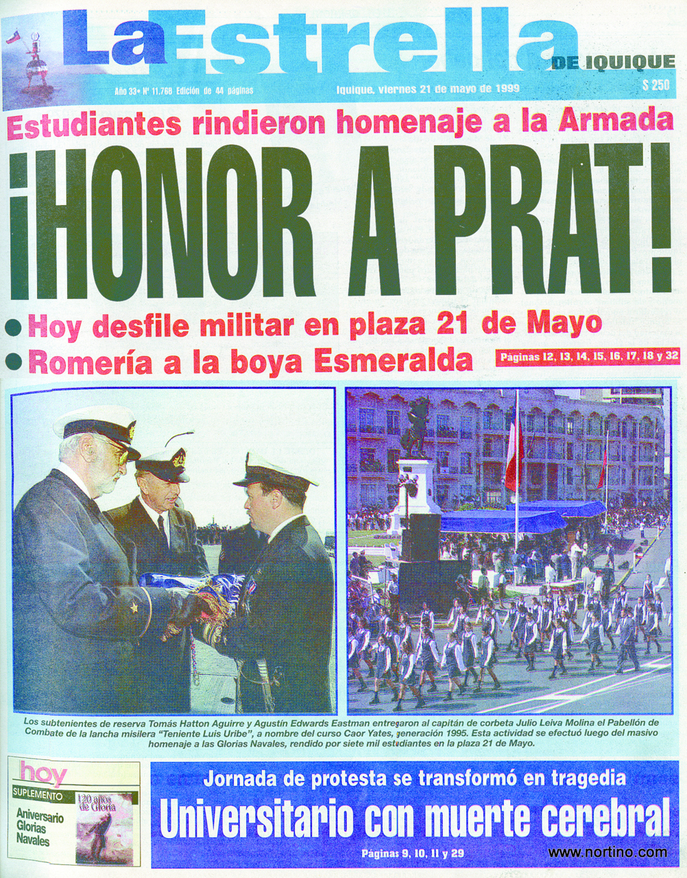 Viernes 21 de mayo de 1999.- Los subtenientes de reserva Tomás Hatton Aguirre y Agustín Edwards Eastman entregaron al capitán de corbeta Julio Leiva Molina el Pabellón de Combate de la lancha misilera “Teniente Luis Uribe”, a nombre del curso Caor Yates, generación 1995. Esta actividad se efectuó luego del masivo homenaje a las Glorias Navales, rendido por siete mil estudiantes en la Plaza 21 de Mayo.