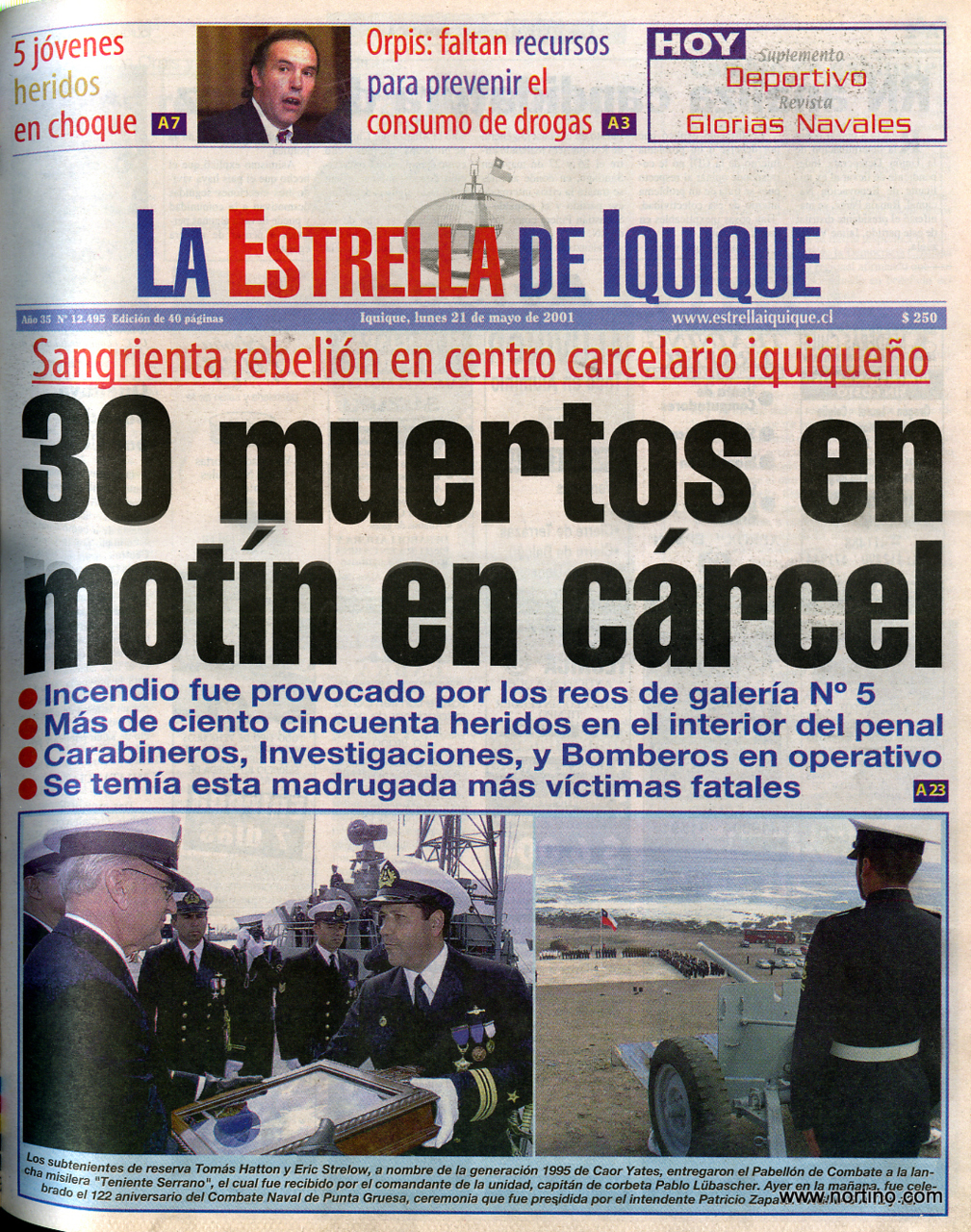 Lunes 21 de mayo de 2001.- Un incendio al interior del Centro de Cumplimiento Penitenciario de Iquique dejó un saldo de 26 muertos.