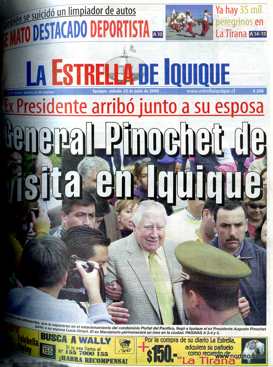 Sábado 13 de julio de 2002.- Una calurosa recepción tuvo en el estacionamiento del condominio Portal del Pacífico el general Augusto Pinochet, quien llegó a Iquique acompañado de su esposa Lucía Hiriart, un médico y dos paramédicos. Lucía Hiriart al llegar al condominio y ver la manifestación en favor de su esposo dijo estar contenta en la ciudad. “Mi marido hizo muchas cosas por Iquique por eso su gente nos ha respondido con ese cariño. Se que nos quieren y nosotros los queremos mucho”.