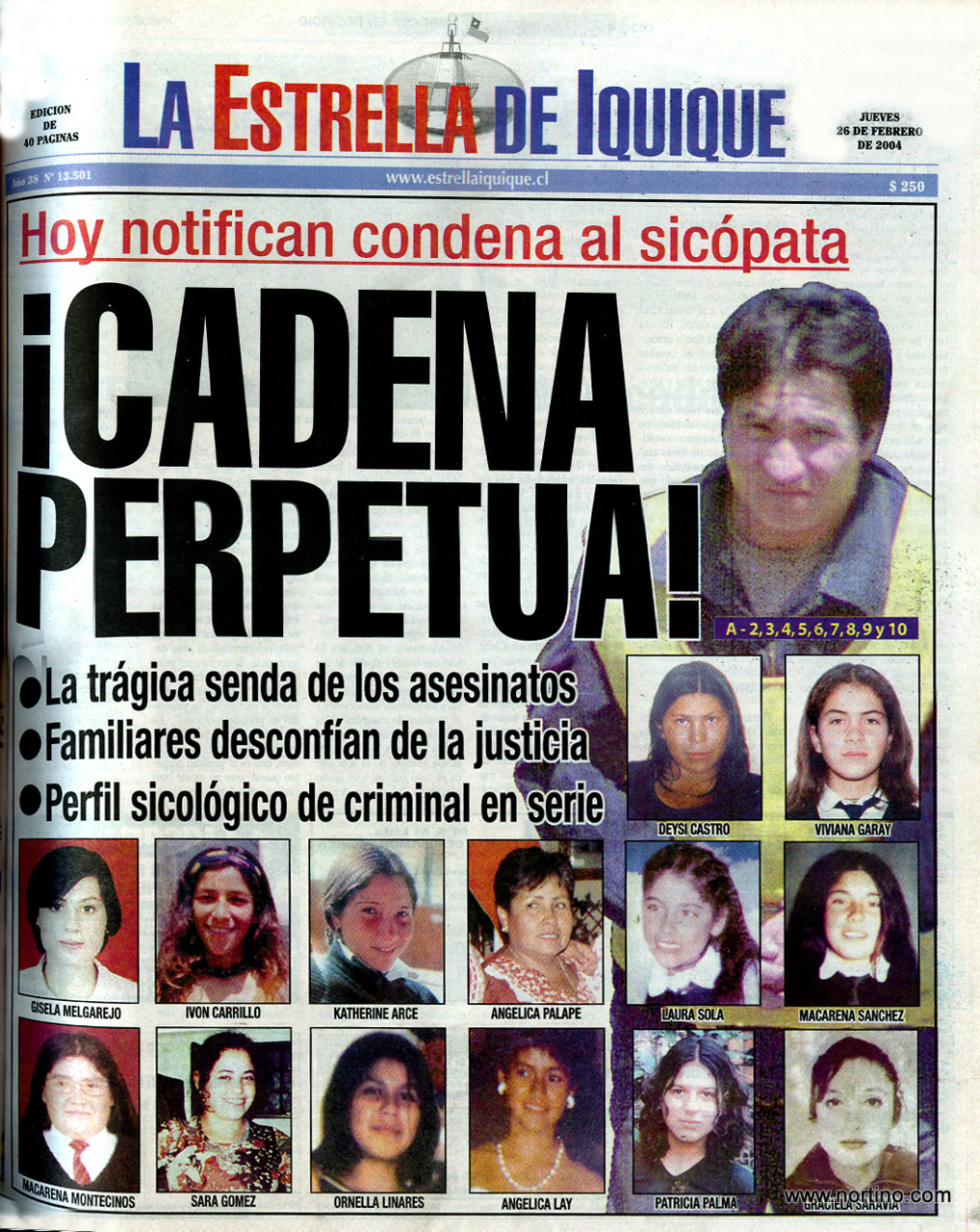 Jueves 26 de febrero de 2004.- Fue notificado personalmente de su condena el homicida en serie de Alto Hospicio, Julio Segundo Pérez Silva. El fallo lo redactó la ministra en visita Eliana Ayala y consta de 140 fojas. Si bien se desconoce oficialmente la sentencia, trascendió que se trataría de una condena perpetua efectiva, es decir, 40 años de presidio, más las respectivas inhabilitaciones y multas. Para ello, la magistrada utilizó jurisprudencia nacional y desestimó antecedentes internacionales donde al procesado se le castiga en forma independiente por cada uno de los delitos.