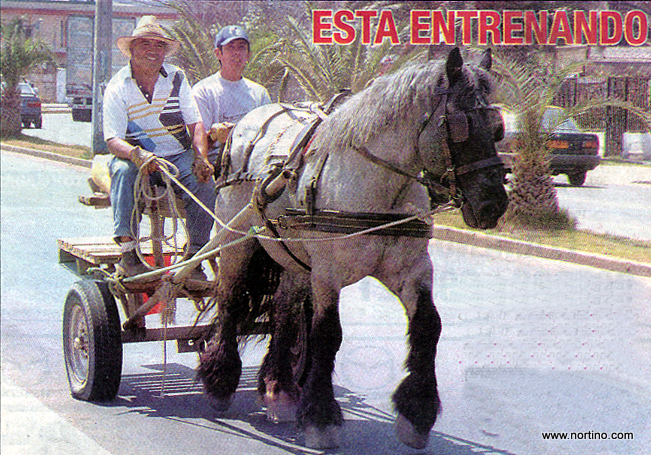 Lunes 2 de febrero de 2004.- Otelo se está entrenando para tirar el tranvía de calle Baquedano. El caballo es sometido a un intenso acondicionamiento, razón por la cual todas las mañanas es sacado a dar una vuelta por sus guías. Hasta el momento ha cumplido muy bien.