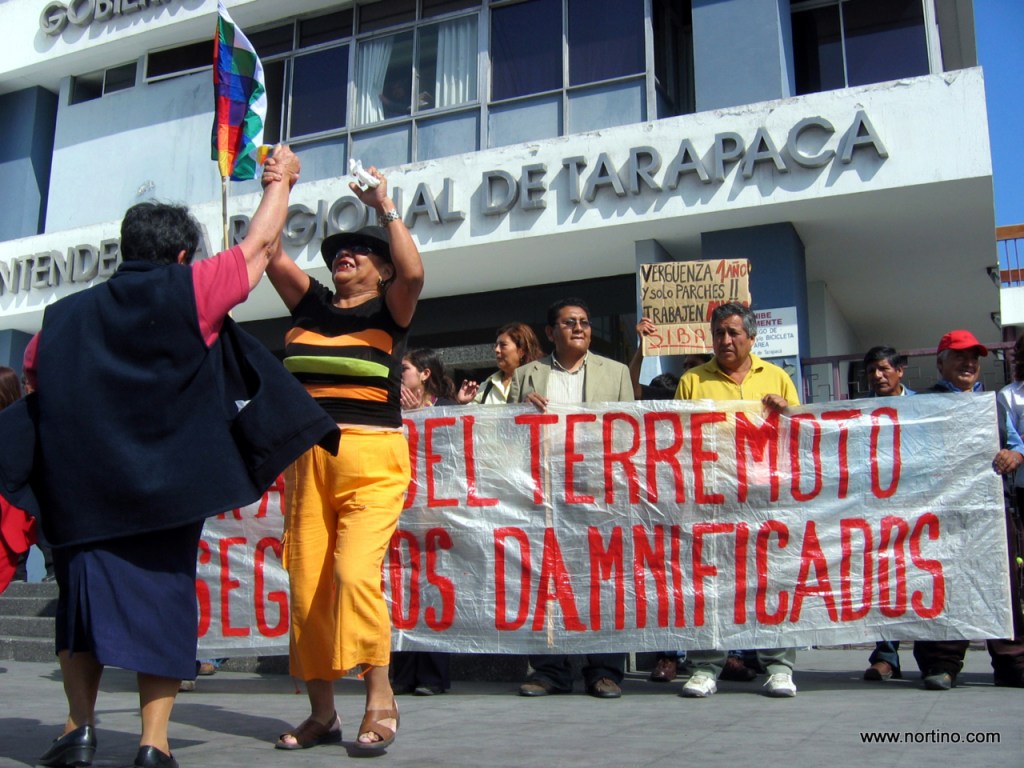 Miércoles 14 de junio de 2006.- Representantes de Pozo Almonte, Laonzana, Huaviña, Limaxiña y Mocha marcharon por las calles de Iquique para manifestar su molestia con el proceso de reconstrucción al cumplirse un año del terremoto. Durante las semanas siguientes las críticas aumentaron desde distintos sectores sobre la lentitud para llevar adelante los proyectos, especialmente del Ministerio de Vivienda.