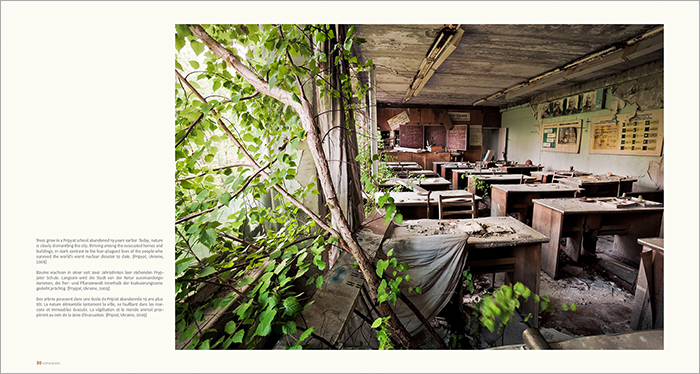 La larga sombra de Chernobyl es un libro fotográfico de Gerd Ludwing, quien ha visitado 9 veces esta zona radioactiva en los últimos 20 años. Los árboles crecen y entran en las salas de clases.