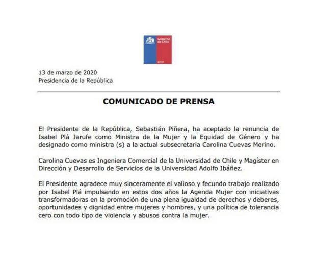 Presidente Piñera acepta renuncia de la Ministra de la Mujer https://ift.tt/38LXHYU