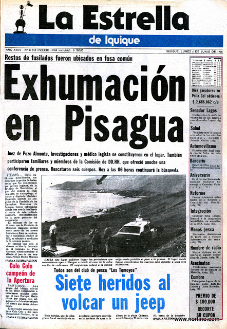 Lunes 4 de junio de 1990.- Siete cadáveres momificados, con evidentes impactos de balas, hecho que fue comprobado por peritos legistas de la Brigada de Homicidios, el juez del Crimen de Pozo Almonte, un antropólogo, el doctor y diputado Vladislav Kuzmicic, además de abogados de la Comisión de los Derechos Humanos de Iquique, fueron exhumados de una fosa común localizada al norte de este poblado pesquero, inmediatamente en la parte posterior del cementerio.
