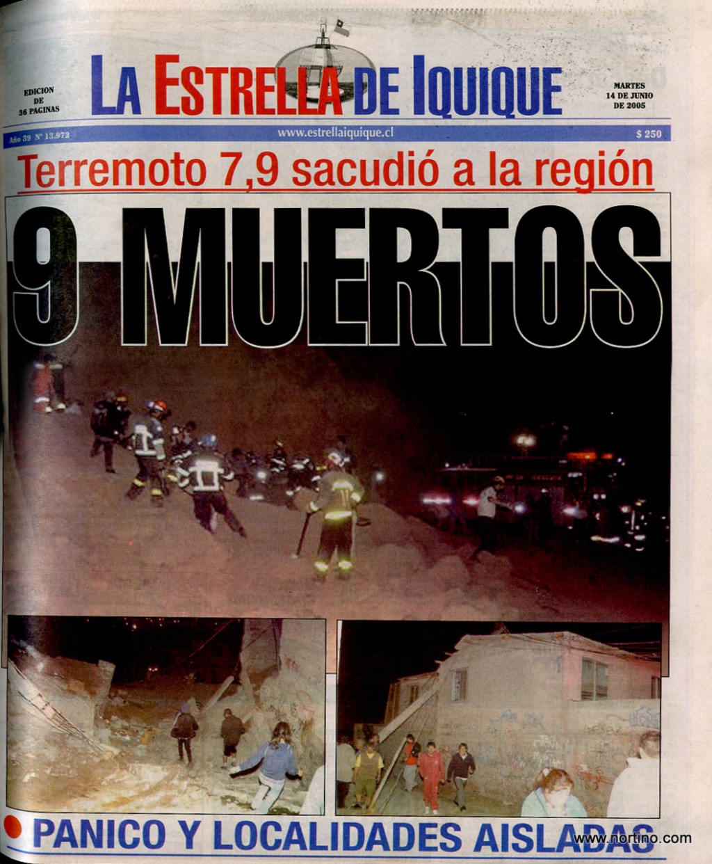 Martes 14 de junio 2005.- Nueve muertos, decenas de casas destruidas y escenas de pánico provocó un terremoto grado 7,9 en la escala Richter que afectó a Iquique y a la Primera, Segunda y Tercera Regiones. El epicentro estuvo 41 kilómetros al sur de Chiapa y a 110 kilómetros al noreste de Iquique. El sismo se registró a las 18.44 horas.