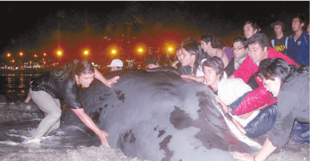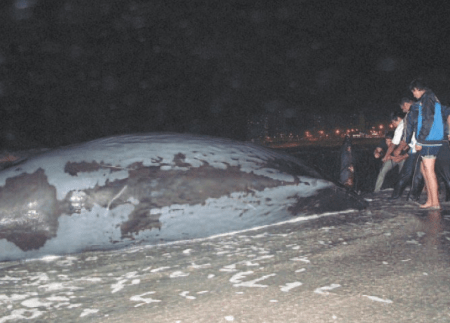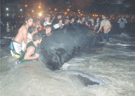 En Playa Brava se varó una ballena. Una red se enredó en una aleta. Trataron de salvarla, pero murió esta mañana.