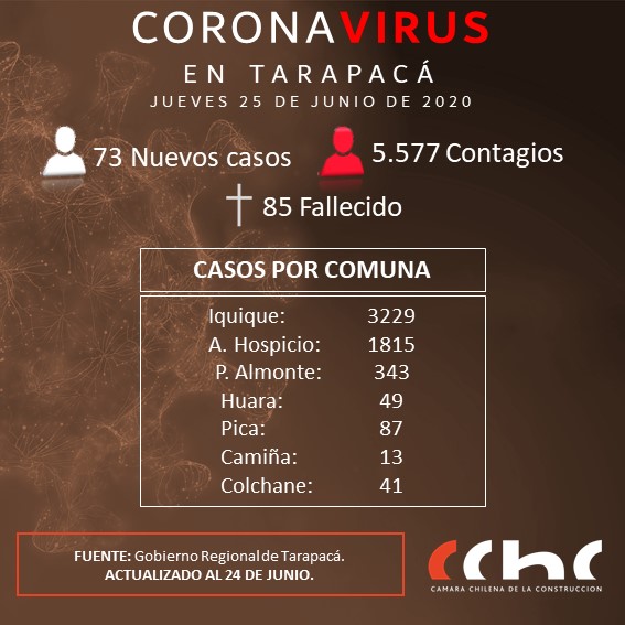 Tarapacá registró 122 casos nuevos en las últimas 24 horas, casi el doble de personas anunciadas ayer por el Gobierno Regional (59). El total de confirmados con Covid-19 aumentó a 5.893, siendo la quinta región con más positivos, detrás de la Metropolitana, Valparaíso, Antofagasta y Biobío.26 de junio