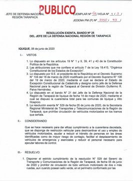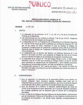 La autoridad ha mantenido esta resolución. La medida fue establecida en la resolución N°23.393, que además solicita al Jefe de la Defensa Nacional de la Región Tarapacá (JEDENA) la fiscalización y cumplimiento de la misma a través de personal de las Fuerzas Armadas, de Orden y Seguridad.