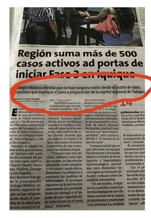 La Estrella de Iquique indicó que la región tenía más de 500 casos activos en momento que comenzó la Fase 3 en Iquique. El Colegio Médico advirtió que no existe razón sanitaria que explique el paso a fase de preparación.