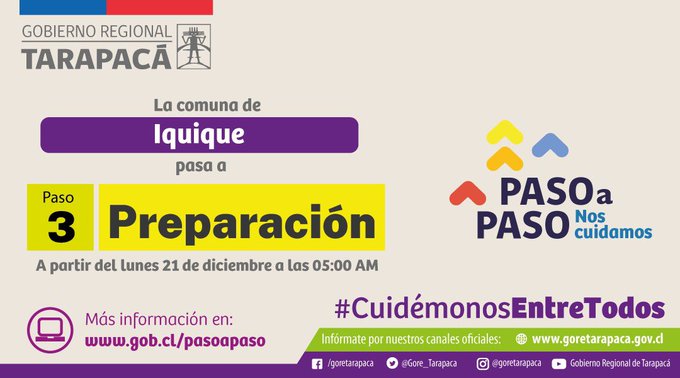 La Subsecretaria de Prevención del Delito, Katherine Martorell, señaló que la medida comenzará a regir a partir del lunes 21 de diciembre a las 5:00 horas.Es destacar, que que el pasado 1° de octubre las comunas de Iquique y Alto Hospicio, salieron de la cuarentena y avanzaron a la etapa de transición, fase 2 del Plan Paso.